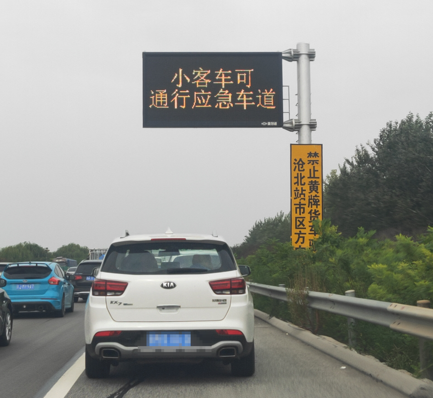 最后,还有一种快车司机,明明看到了前方应急车道可通行的信息,但是跑了几十公里之后,又缩回慢车道了。可能他们怕交警晃点他们,后面判司机违规。哈哈哈。我特意让小朋友拍摄了好几个指示牌,也就是说在河北段,车都可以走应急车道。因为一进入天津,车道变成四车道了,让你走你都不走了。只有河北段才给了这个政策,所以当机会来临的时候,你就大胆地用起来。