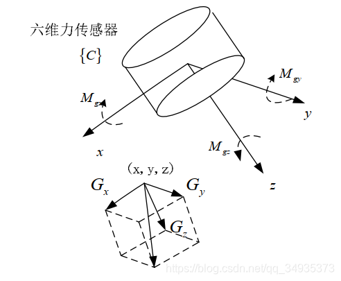 六维力传感器是一种特殊的力觉传感器,可以测量物体在笛卡尔坐标系下三个轴向的力(Fx、Fy、Fz)和力矩(Mx、My、Mz),如下图所示。